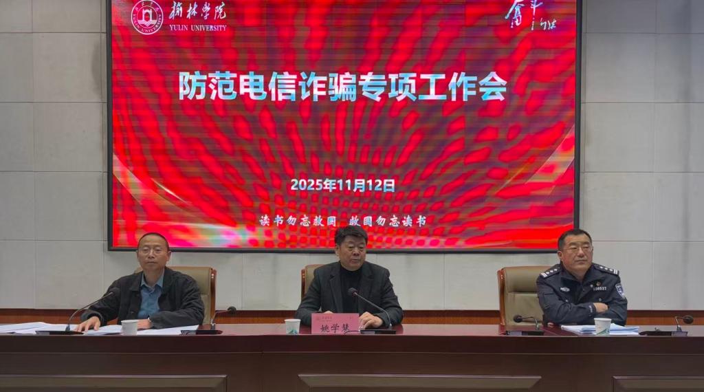 11月12日,榆林学院防范电信诈骗专项工作会在学校逸夫楼一楼报告厅召开。会议认真分析当前学校反诈工作面临的复杂严峻形势,对下一阶段校园反诈工作作了安排部署。副校长姚学慧主持会议并讲话,辖区派出所所长王真受邀作反诈专题辅导,保卫处负责人通报近期校园反诈工作总体情况。学工部、保卫处、团委、招生就业处以及各二级学院等有关单位负责人参加会议。